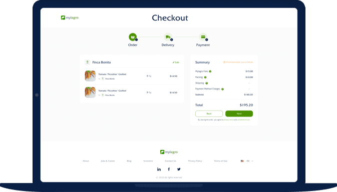 Transact with the confidence offered by our efficient and transparent payment system which protects you and the producer. The money transferred to the producer will be guaranteed 2 days after the delivery of your products so that you have enough time to share with him any comments, to ask him for clarifications or make claims. In case you don’t reach an agreement, you can escalate your claim to mylagro, but keep in mind that this will negatively affect the producer’s reputation.